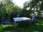 – eine Sitzgruppe im Garten mit Sonnenschirm und Grill gehört ebenfalls zum Ferienobjekt